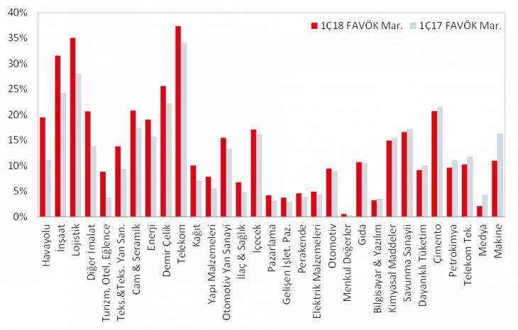 Aşağıdaki grafikte sektörel bazda 1Ç2018/1Ç2017 FAVÖK marjları verilmiştir. Buna göre, sektörel bazda FAVÖK marjında en yüksek iyileşme Havacılık sektöründe olurken, en fazla düşüşün kaydedildiği sektörler ise sırasıyla Makine ve Medya sektörleri olmuştur.