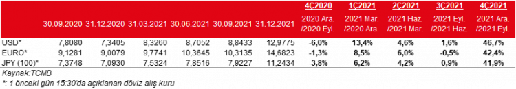 2021 yılının son çeyreğinde TL’ye göre Dolar, Euro ve Japon Yeni sırasıyla %46,7, %42,4 ve %41,9 oranlarında değer kazanmışlardır. Dolayısıyla döviz açık pozisyonları olan şirketlerin bu durumdan oldukça olumsuz etkilenmesi beklenmektedir.