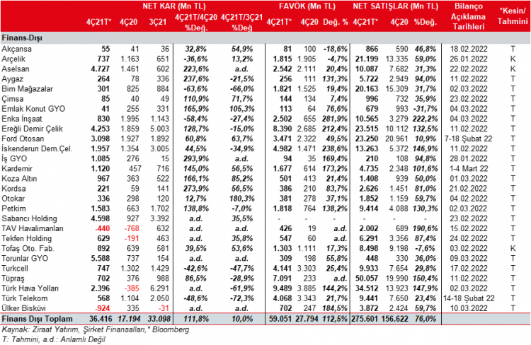 Tüm bu gelişmelere bağlı olarak yaptığımız tahminlere göre takibimizdeki banka dışı şirketlerde, toplam karın 2021 yılının 4. çeyreğinde 36.416mn TL seviyesinde gerçekleşeceğini ve yıllık %111,8 oranında artacağını öngörüyoruz. Kaydedilmesi öngörülen bu artışta Torunlar GYO, Sabancı Holding ve Aselsan’ın karlılıklarının oldukça yüksek olacağı beklentisi ile THY’ nin 4Ç2020’deki zararlardan 4Ç2021’de kara geçmesi önemli etkenlerdir.