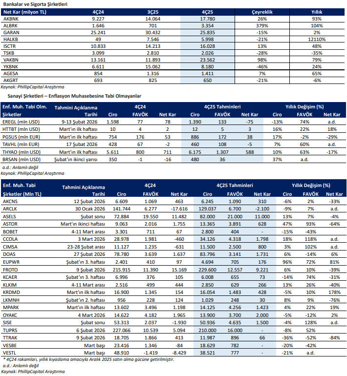 – Bankalar: Kârlılık tarafında fonlama maliyetindeki kısmi gerileme ve durasyonun kısa olması nedeniyle 4Ç25 net faiz marjı bir önceki dönemin hafif üzerinde beklenebilir. Bilanço içi net döviz pozisyonunun bir önceki döneme göre artışı, TCMB fonlama maliyetindeki gerilemeye rağmen, swap giderlerinde bir artışa neden olabilir. TÜFE’ye endeksli menkul kıymetlerin katkısı da hafifçe artabilir. Komisyon gelirlerindeki artışın sürüyor olması ve daha kontrollü faaliyet gider artışları karlılıklara olumlu destek vermeye devam etmiştir. Net kredi risk maliyeti tarafında sektörel ortalamanın 200 baz puan civarında kalmaya devam etmesi, aktif kalitesinin göreceli olarak korunduğuna işaret etmektedir. Vergi yükünde enflasyon muhasebesine ilişkin yasal düzenlemeye bağlı artış kaynaklı tek seferlik bir vergi giderinin karlılığı baskılayacağını da göz ardı etmemek gerekir.