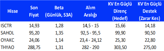 Teknik takibimizde olan hisseler için uygun alım aralıkları, hedef fiyat ve zarar kes seviyeleri tamamen teknik analiz dinamikleri göz önünde bulundurularak belirlenmektedir. Piyasa koşullarındaki genel değişimlerin bu hisseleri de BETA’ları oranınca etkilemesi beklenebilir.