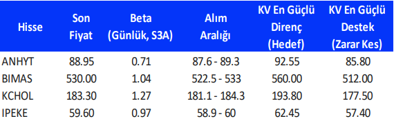 Teknik takibimizde olan hisseler için uygun alım aralıkları, hedef fiyat ve zarar kes seviyeleri tamamen teknik analiz dinamikleri göz önünde bulundurularak belirlenmektedir. Piyasa koşullarındaki genel değişimlerin bu hisseleri de BETA’ları oranınca etkilemesi beklenebilir.