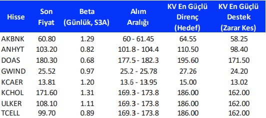 Teknik takibimizde olan hisseler için uygun alım aralıkları, hedef fiyat ve zarar kes seviyeleri tamamen teknik analiz dinamikleri göz önünde bulundurularak belirlenmektedir. Piyasa koşullarındaki genel değişimlerin bu hisseleri de BETA’ları oranınca etkilemesi beklenebilir.