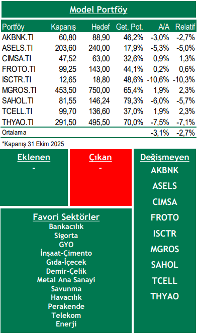 Fed’in faiz indirimlerine devam etmesi, tarifeler konusunda belirsizliklerin azalması ve yurt içinde ise enflasyonda mevsimsel etkiler nedeniyle aylık bazda yükselişler görülse de enflasyonun ana eğiliminin dezenflasyon sürecine işaret etmesi nedeniyle TCMB’nin gevşeme döngüsüne devam etmesini bekliyoruz. TCMB’nin faiz indirimlerine devam edeceği beklentisiyle ekonomide dengelenme dönemine girileceği, bunun da başta bankacılık sektörü olmak üzere faiz hassasiyeti yüksek sektörleri, sonrasında ise reel kesimi olumlu etkilemesini bekliyoruz. Bu gelişmelerin ışığında BİST’te kasım ayında pozitif dalgalı bir seyir izlenmesini bekliyoruz. Piyasada dönem dönem geri çekilmeler olsa da orta-uzun vade için kademeli alım önerimizi koruyoruz.