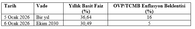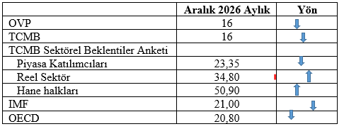 Bu tabloda dikkati çeken noktalar şunlar: (1) Hükümet (OVP) ve Merkez Bankası (TCMB) enflasyonun 2026 sonunda ciddi biçimde gerileyerek yüzde 30,89’dan 16’ya düşeceğini tahmin ediyor. (2) TCMB’nin sektörel enflasyon beklentileri anketini yanıtlayanlardan piyasa katılımcıları grubu 2026 sonunda enflasyonun yüzde 23,35’e düşeceğini, reel sektör temsilcileri yüzde 34,80’e ve hane halklarının temsilcileri ise yüzde 50,90’a yükseleceğini bekliyorlar. Piyasa katılımcıları enflasyonda düşüş beklese de bu düşüş hükümetin ve TCMB’nin tahminlerinin oldukça üzerinde bir düzeyde kalınacağını işaret ediyor. (3) IMF ve OECD’nin beklentileri de enflasyonun düşeceği ama yüzde 20’nin altına inmeyeceği yolunda.
