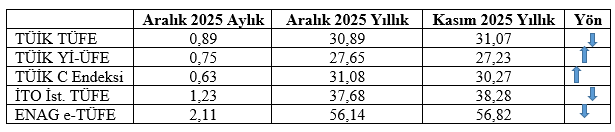 Tabloya bakıldığında TÜİK TÜFE enflasyonu düşüyor, TÜİK Yİ-ÜFE enflasyonu artıyor, TÜİK çekirdek enflasyonu (C Endeksi) yükseliyor, İTO İstanbul TÜFE enflasyonu ve ENAG e-TÜFE enflasyonu düşüyor. Burada dikkati çeken Yİ-ÜFE ve çekirdek enflasyondaki yükselişler. Uygulanan dezenflasyon programına karşın bu ikisinin yükselişi gelecek için sıkıntılı bir görünüme işaret ediyor.