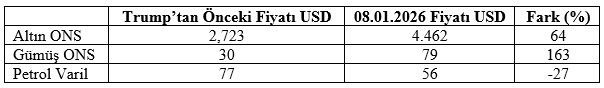 Aşağıdaki tablo altın, gümüş ve ham petrol (Brent) fiyatlarının Trump göreve başlamadan bir gün önceki fiyatlarıyla bugünkü fiyatlarını ve iki tarih arasındaki değişim oranını gösteriyor: