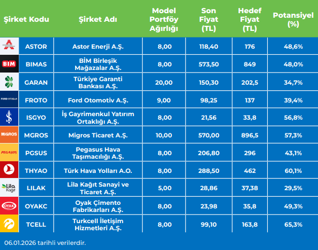 2026 yılında model portföyü belirlerken genel temalarımızdan biri 2025’de dirayetli kalan, finansal performansı en az etkilenen şirketler oldu. Bu çerçevede sektörden öte şirket seçimine öncelik verdik. Diğer taraftan hane halkının alım gücünün iyileşeceği beklentisiyle perakende sektöründe güçlü gördüğümüz BIMAS, MGROS’u, otomotiv sektöründe ise FROTO’yu model portföyümüze dahil ettik. BIST’in yükselişinde bankalar öncü oldu. Bankacılık sektöründe gerek net faiz marjı, gerekse aktif karlılığı ve özkaynak karlılığı bakımından öne çıkan GARAN 2026 yılında model portföyümüzde yer alacak. GYO’ların net aktif değerine göre yüksek iskonto ile işlem gördüğü 2025 ardından portföy çeşitliliği yüksek, düzenli kira gelirine sahip olan ISGYO’ya model portföyümüzde yer veriyoruz. 2025 ikinci yarısında hisse senedi performansı zayıf kalsa da havacılık sektörünün cazip çarpanlarla işlem görmeye devam ettiğini görmekteyiz. Model portföyümüzde bir diğer seçimimiz ise zorlu 2025 yılında yatırımlarını tamamlayan ve 2026 yılında %100 kapasite artışıyla faaliyet gösterecek olan ASTOR ve yine 2026 ve 2027 yılında yeni yatırımları tamamlanacak olan LILAK yer almakta. oldu. 2026 yılı hem konut talebinin canlandığı hem de kentsel dönüşüm projelerinin hızlandığı bir yıl olma adayı. Bu konjonktürde Türkiye’de yaklaşık %18 paya sahip OYAKC’yu cazip buluyor ve hisseye model portföyde yer veriyoruz. İletişim sektöründe güçlü kullanıcı başı gelir büyümesiyle öne çıkan TCELL’in 2026’da da bu performansını sürdürebileceği görüşündeyiz.