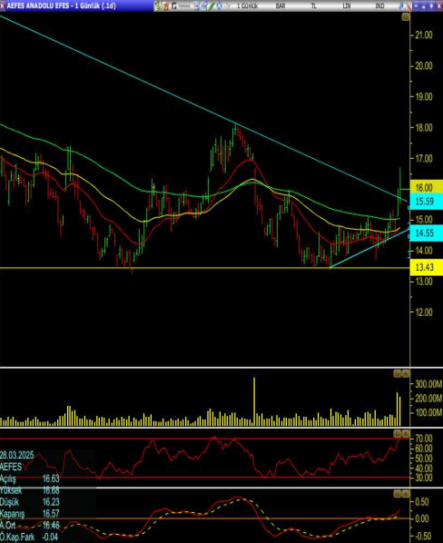 • Kısa vadeli bir risk kontrolü için stoploss, kırılan eğim ya da 14–14.5 TL civarında yakın destek altına konulabilir. Kısa vadede 16.70 ilk direnç ve kırılma devam ederse 18 TL üzeri hedeflenebilir.