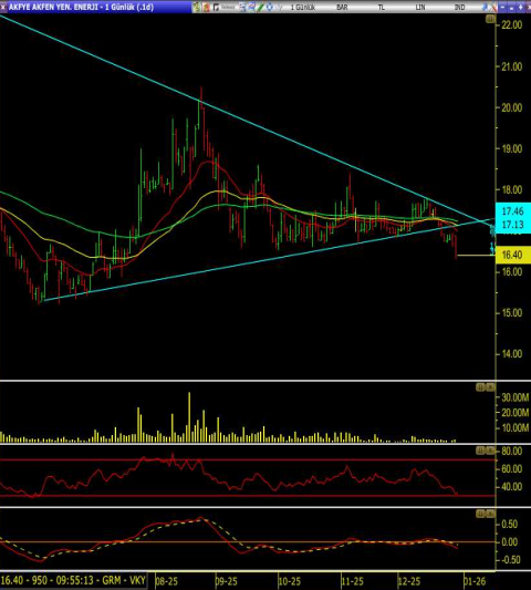 Fiyat şu an 16,34 civarında ve hem üçgenin alt bandı hem de kısa– orta vadeli hareketli ortalamalar altında seyrediyor; bu tablo tepki alımlarının sınırlı kalabileceğini gösteriyor.