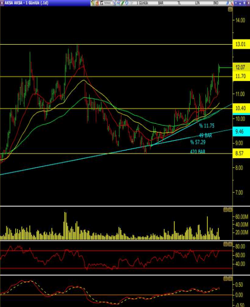 • 10,40 bandı daha önce güçlü dirençken aşılmış ve artık destek konumuna geçmiş durumda ve hisse, 11,70 ara direncini hacimli şekilde kırarak 12,06 seviyesine geldi.