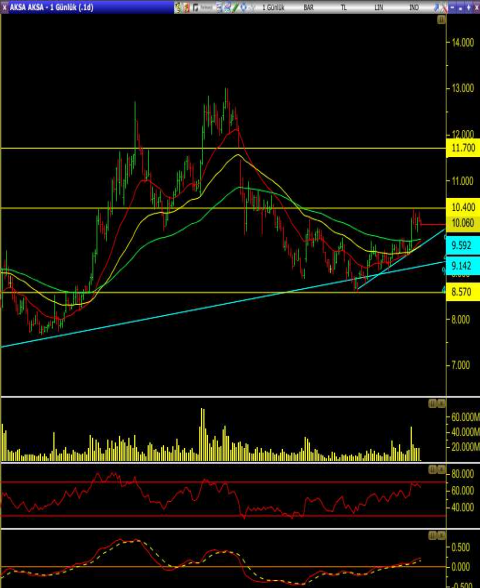 • Önemli ortalamaları üzerinde hareket eden hisse 10.40 seviyesini test ediyor ancak aşamıyor.