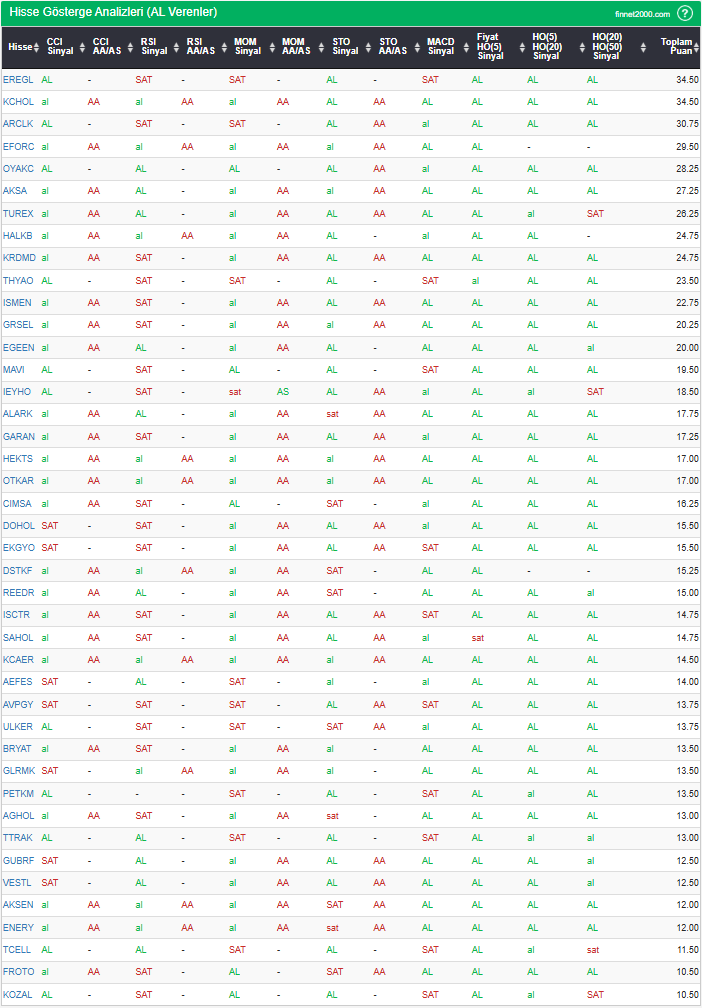 Bu çalışmada “AL” sinyali veren hisselerin tespiti amacıyla Borsa’da işlem gören BIST 100 hisseler değerlendirmeye alınmıştır. BIST 100 üzerinde teknik analizde kullanılan 12 gösterge yöntemi ile değerleme yapılarak puanlamaya gidilerek hisseler sıralanmıştır. Ancak hisse seçiminde teknik göstergelerin tek başına kullanılması yeterli değildir. Burada ön plana çıkan hisselerin temel analizle desteklemesi ve hisseyle ilgili son haber ve bilgilerin de değerlendirilerek işlemde bulunması, daha sağlıklı sonuçlar için yararlı olacaktır.