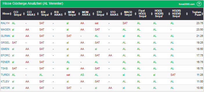 Bu çalışmada “AL” sinyali veren hisselerin tespiti amacıyla Borsa’da işlem gören BIST 100 hisseler değerlendirmeye alınmıştır. BIST 100 üzerinde teknik analizde kullanılan 12 gösterge yöntemi ile değerleme yapılarak puanlamaya gidilerek hisseler sıralanmıştır. Ancak hisse seçiminde teknik göstergelerin tek başına kullanılması yeterli değildir. Burada ön plana çıkan hisselerin temel analizle desteklemesi ve hisseyle ilgili son haber ve bilgilerin de değerlendirilerek işlemde bulunması, daha sağlıklı sonuçlar için yararlı olacaktır.
