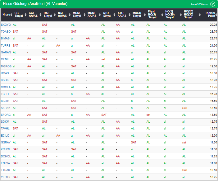 Bu çalışmada “AL” sinyali veren hisselerin tespiti amacıyla Borsa’da işlem gören BIST 100 hisseler değerlendirmeye alınmıştır. BIST 100 üzerinde teknik analizde kullanılan 12 gösterge yöntemi ile değerleme yapılarak puanlamaya gidilerek hisseler sıralanmıştır. Ancak hisse seçiminde teknik göstergelerin tek başına kullanılması yeterli değildir. Burada ön plana çıkan hisselerin temel analizle desteklemesi ve hisseyle ilgili son haber ve bilgilerin de değerlendirilerek işlemde bulunması, daha sağlıklı sonuçlar için yararlı olacaktır.