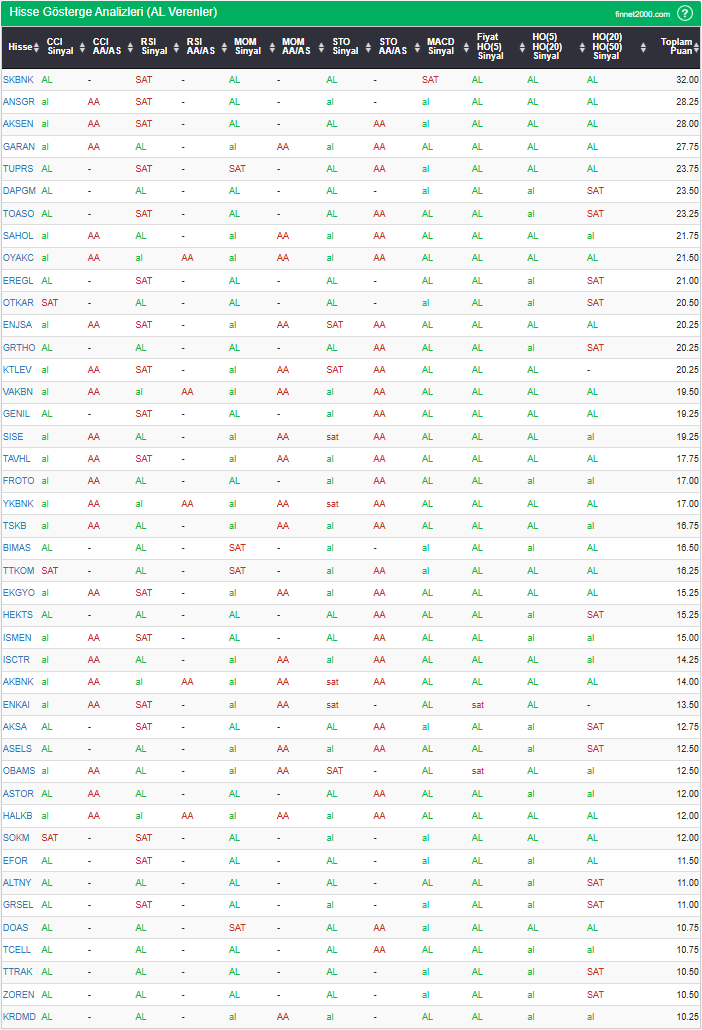 Bu çalışmada “AL” sinyali veren hisselerin tespiti amacıyla Borsa’da işlem gören BIST 100 hisseler değerlendirmeye alınmıştır. BIST 100 üzerinde teknik analizde kullanılan 12 gösterge yöntemi ile değerleme yapılarak puanlamaya gidilerek hisseler sıralanmıştır. Ancak hisse seçiminde teknik göstergelerin tek başına kullanılması yeterli değildir. Burada ön plana çıkan hisselerin temel analizle desteklemesi ve hisseyle ilgili son haber ve bilgilerin de değerlendirilerek işlemde bulunması, daha sağlıklı sonuçlar için yararlı olacaktır.