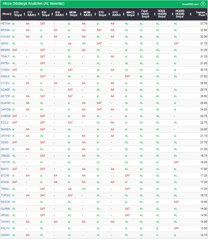 Bu çalışmada “AL” sinyali veren hisselerin tespiti amacıyla Borsa’da işlem gören BIST 100 hisseler değerlendirmeye alınmıştır. BIST 100 üzerinde teknik analizde kullanılan 12 gösterge yöntemi ile değerleme yapılarak puanlamaya gidilerek hisseler sıralanmıştır. Ancak hisse seçiminde teknik göstergelerin tek başına kullanılması yeterli değildir. Burada ön plana çıkan hisselerin temel analizle desteklemesi ve hisseyle ilgili son haber ve bilgilerin de değerlendirilerek işlemde bulunması, daha sağlıklı sonuçlar için yararlı olacaktır.