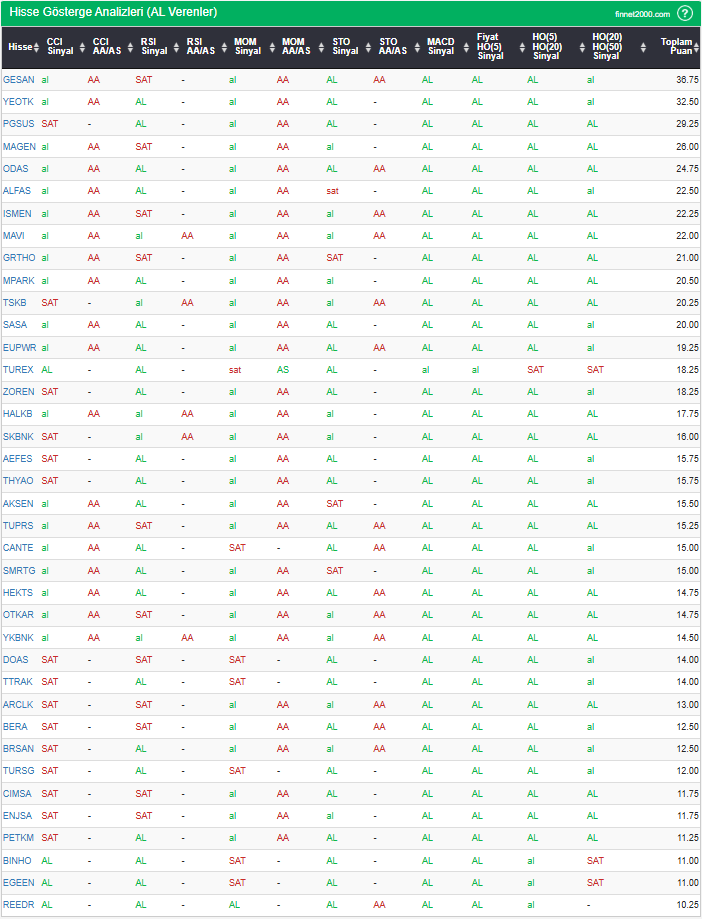 Bu çalışmada “AL” sinyali veren hisselerin tespiti amacıyla Borsa’da işlem gören BIST 100 hisseler değerlendirmeye alınmıştır. BIST 100 üzerinde teknik analizde kullanılan 12 gösterge yöntemi ile değerleme yapılarak puanlamaya gidilerek hisseler sıralanmıştır. Ancak hisse seçiminde teknik göstergelerin tek başına kullanılması yeterli değildir. Burada ön plana çıkan hisselerin temel analizle desteklemesi ve hisseyle ilgili son haber ve bilgilerin de değerlendirilerek işlemde bulunması, daha sağlıklı sonuçlar için yararlı olacaktır.