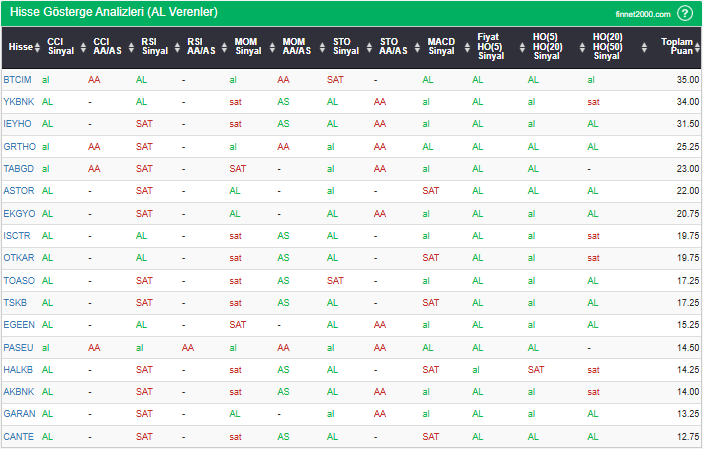 Bu çalışmada “AL” sinyali veren hisselerin tespiti amacıyla Borsa’da işlem gören BIST 100 hisseler değerlendirmeye alınmıştır. BIST 100 üzerinde teknik analizde kullanılan 12 gösterge yöntemi ile değerleme yapılarak puanlamaya gidilerek hisseler sıralanmıştır. Ancak hisse seçiminde teknik göstergelerin tek başına kullanılması yeterli değildir. Burada ön plana çıkan hisselerin temel analizle desteklemesi ve hisseyle ilgili son haber ve bilgilerin de değerlendirilerek işlemde bulunması, daha sağlıklı sonuçlar için yararlı olacaktır.