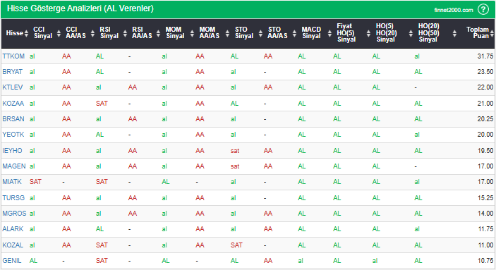 Bu çalışmada “AL” sinyali veren hisselerin tespiti amacıyla Borsa’da işlem gören BIST 100 hisseler değerlendirmeye alınmıştır. BIST 100 üzerinde teknik analizde kullanılan 12 gösterge yöntemi ile değerleme yapılarak puanlamaya gidilerek hisseler sıralanmıştır. Ancak hisse seçiminde teknik göstergelerin tek başına kullanılması yeterli değildir. Burada ön plana çıkan hisselerin temel analizle desteklemesi ve hisseyle ilgili son haber ve bilgilerin de değerlendirilerek işlemde bulunması, daha sağlıklı sonuçlar için yararlı olacaktır.