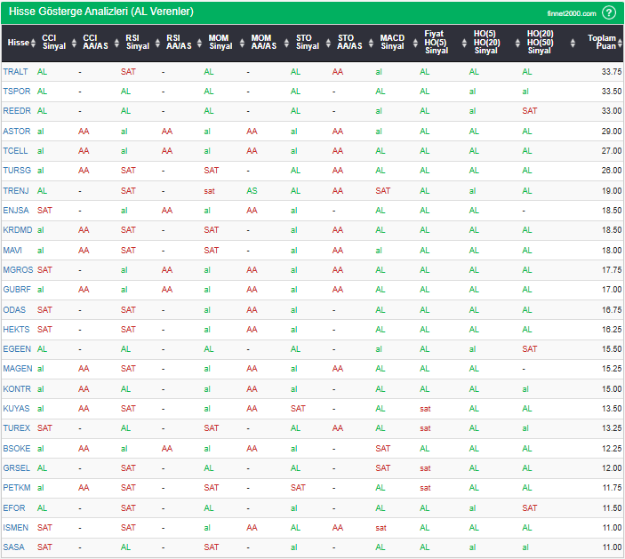 Bu çalışmada “AL” sinyali veren hisselerin tespiti amacıyla Borsa’da işlem gören BIST 100 hisseler değerlendirmeye alınmıştır. BIST 100 üzerinde teknik analizde kullanılan 12 gösterge yöntemi ile değerleme yapılarak puanlamaya gidilerek hisseler sıralanmıştır. Ancak hisse seçiminde teknik göstergelerin tek başına kullanılması yeterli değildir. Burada ön plana çıkan hisselerin temel analizle desteklemesi ve hisseyle ilgili son haber ve bilgilerin de değerlendirilerek işlemde bulunması, daha sağlıklı sonuçlar için yararlı olacaktır.