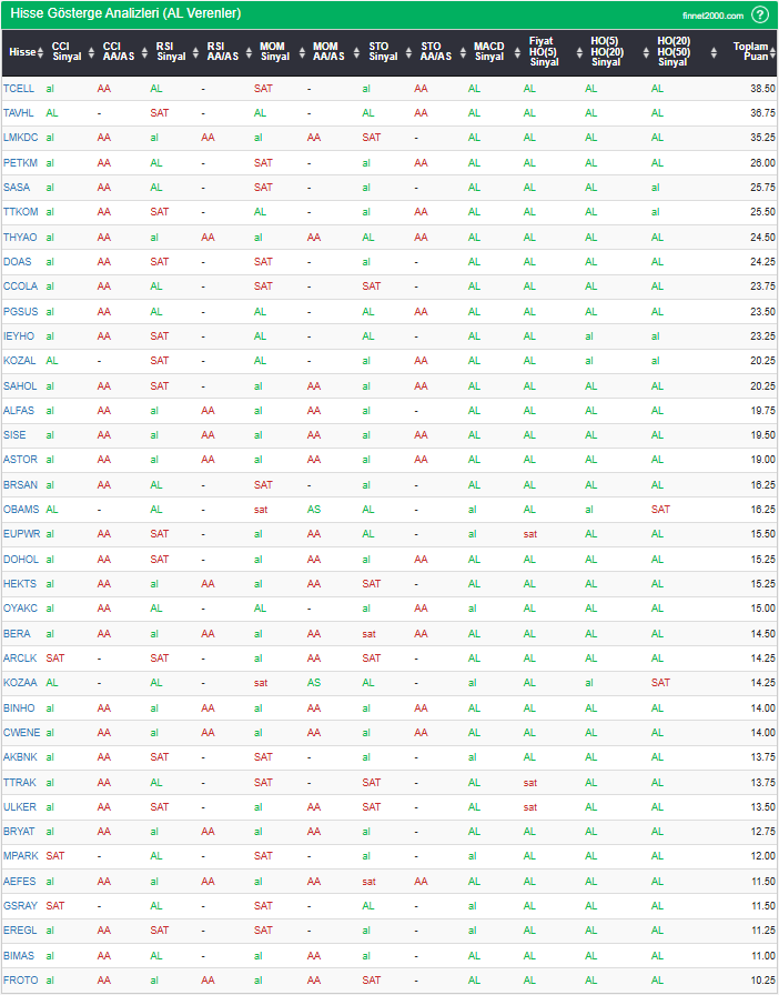 Bu çalışmada “AL” sinyali veren hisselerin tespiti amacıyla Borsa’da işlem gören BIST 100 hisseler değerlendirmeye alınmıştır. BIST 100 üzerinde teknik analizde kullanılan 12 gösterge yöntemi ile değerleme yapılarak puanlamaya gidilerek hisseler sıralanmıştır. Ancak hisse seçiminde teknik göstergelerin tek başına kullanılması yeterli değildir. Burada ön plana çıkan hisselerin temel analizle desteklemesi ve hisseyle ilgili son haber ve bilgilerin de değerlendirilerek işlemde bulunması, daha sağlıklı sonuçlar için yararlı olacaktır.