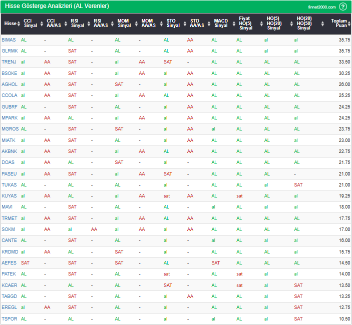 Bu çalışmada “AL” sinyali veren hisselerin tespiti amacıyla Borsa’da işlem gören BIST 100 hisseler değerlendirmeye alınmıştır. BIST 100 üzerinde teknik analizde kullanılan 12 gösterge yöntemi ile değerleme yapılarak puanlamaya gidilerek hisseler sıralanmıştır. Ancak hisse seçiminde teknik göstergelerin tek başına kullanılması yeterli değildir. Burada ön plana çıkan hisselerin temel analizle desteklemesi ve hisseyle ilgili son haber ve bilgilerin de değerlendirilerek işlemde bulunması, daha sağlıklı sonuçlar için yararlı olacaktır.
