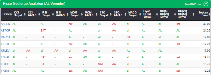Bu çalışmada “AL” sinyali veren hisselerin tespiti amacıyla Borsa’da işlem gören BIST 100 hisseler değerlendirmeye alınmıştır. BIST 100 üzerinde teknik analizde kullanılan 12 gösterge yöntemi ile değerleme yapılarak puanlamaya gidilerek hisseler sıralanmıştır. Ancak hisse seçiminde teknik göstergelerin tek başına kullanılması yeterli değildir. Burada ön plana çıkan hisselerin temel analizle desteklemesi ve hisseyle ilgili son haber ve bilgilerin de değerlendirilerek işlemde bulunması, daha sağlıklı sonuçlar için yararlı olacaktır.