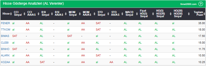 Bu çalışmada “AL” sinyali veren hisselerin tespiti amacıyla Borsa’da işlem gören BIST 100 hisseler değerlendirmeye alınmıştır. BIST 100 üzerinde teknik analizde kullanılan 12 gösterge yöntemi ile değerleme yapılarak puanlamaya gidilerek hisseler sıralanmıştır. Ancak hisse seçiminde teknik göstergelerin tek başına kullanılması yeterli değildir. Burada ön plana çıkan hisselerin temel analizle desteklemesi ve hisseyle ilgili son haber ve bilgilerin de değerlendirilerek işlemde bulunması, daha sağlıklı sonuçlar için yararlı olacaktır.