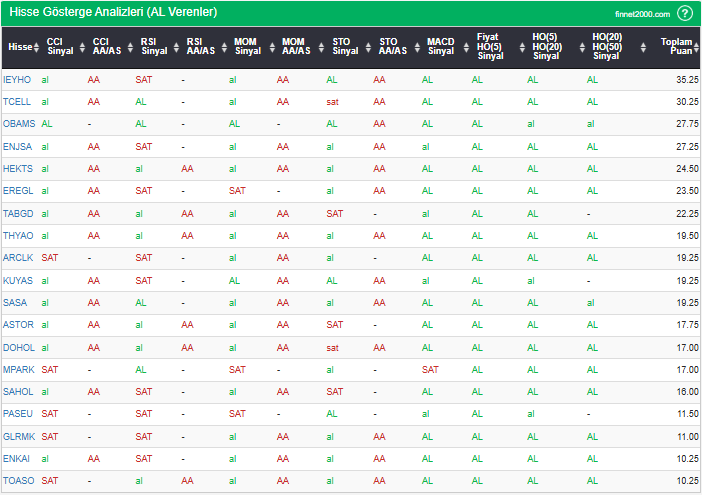 Bu çalışmada “AL” sinyali veren hisselerin tespiti amacıyla Borsa’da işlem gören BIST 100 hisseler değerlendirmeye alınmıştır. BIST 100 üzerinde teknik analizde kullanılan 12 gösterge yöntemi ile değerleme yapılarak puanlamaya gidilerek hisseler sıralanmıştır. Ancak hisse seçiminde teknik göstergelerin tek başına kullanılması yeterli değildir. Burada ön plana çıkan hisselerin temel analizle desteklemesi ve hisseyle ilgili son haber ve bilgilerin de değerlendirilerek işlemde bulunması, daha sağlıklı sonuçlar için yararlı olacaktır.