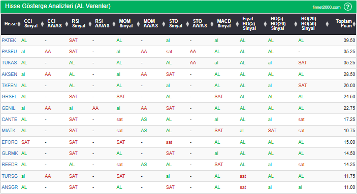 Bu çalışmada “AL” sinyali veren hisselerin tespiti amacıyla Borsa’da işlem gören BIST 100 hisseler değerlendirmeye alınmıştır. BIST 100 üzerinde teknik analizde kullanılan 12 gösterge yöntemi ile değerleme yapılarak puanlamaya gidilerek hisseler sıralanmıştır. Ancak hisse seçiminde teknik göstergelerin tek başına kullanılması yeterli değildir. Burada ön plana çıkan hisselerin temel analizle desteklemesi ve hisseyle ilgili son haber ve bilgilerin de değerlendirilerek işlemde bulunması, daha sağlıklı sonuçlar için yararlı olacaktır.
