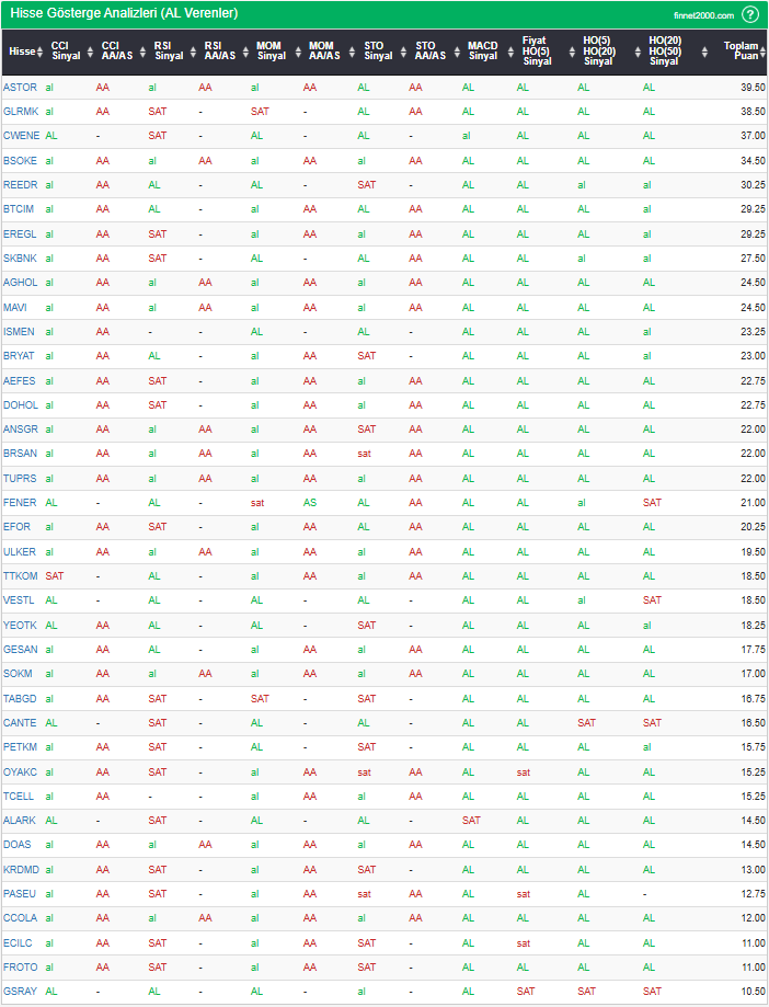 Bu çalışmada “AL” sinyali veren hisselerin tespiti amacıyla Borsa’da işlem gören BIST 100 hisseler değerlendirmeye alınmıştır. BIST 100 üzerinde teknik analizde kullanılan 12 gösterge yöntemi ile değerleme yapılarak puanlamaya gidilerek hisseler sıralanmıştır. Ancak hisse seçiminde teknik göstergelerin tek başına kullanılması yeterli değildir. Burada ön plana çıkan hisselerin temel analizle desteklemesi ve hisseyle ilgili son haber ve bilgilerin de değerlendirilerek işlemde bulunması, daha sağlıklı sonuçlar için yararlı olacaktır.