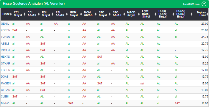 Bu çalışmada “AL” sinyali veren hisselerin tespiti amacıyla Borsa’da işlem gören BIST 100 hisseler değerlendirmeye alınmıştır. BIST 100 üzerinde teknik analizde kullanılan 12 gösterge yöntemi ile değerleme yapılarak puanlamaya gidilerek hisseler sıralanmıştır. Ancak hisse seçiminde teknik göstergelerin tek başına kullanılması yeterli değildir. Burada ön plana çıkan hisselerin temel analizle desteklemesi ve hisseyle ilgili son haber ve bilgilerin de değerlendirilerek işlemde bulunması, daha sağlıklı sonuçlar için yararlı olacaktır.