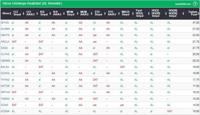 Bu çalışmada “AL” sinyali veren hisselerin tespiti amacıyla Borsa’da işlem gören BIST 100 hisseler değerlendirmeye alınmıştır. BIST 100 üzerinde teknik analizde kullanılan 12 gösterge yöntemi ile değerleme yapılarak puanlamaya gidilerek hisseler sıralanmıştır. Ancak hisse seçiminde teknik göstergelerin tek başına kullanılması yeterli değildir. Burada ön plana çıkan hisselerin temel analizle desteklemesi ve hisseyle ilgili son haber ve bilgilerin de değerlendirilerek işlemde bulunması, daha sağlıklı sonuçlar için yararlı olacaktır.