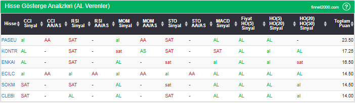 Bu çalışmada “AL” sinyali veren hisselerin tespiti amacıyla Borsa’da işlem gören BIST 100 hisseler değerlendirmeye alınmıştır. BIST 100 üzerinde teknik analizde kullanılan 12 gösterge yöntemi ile değerleme yapılarak puanlamaya gidilerek hisseler sıralanmıştır. Ancak hisse seçiminde teknik göstergelerin tek başına kullanılması yeterli değildir. Burada ön plana çıkan hisselerin temel analizle desteklemesi ve hisseyle ilgili son haber ve bilgilerin de değerlendirilerek işlemde bulunması, daha sağlıklı sonuçlar için yararlı olacaktır.