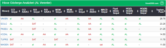 Bu çalışmada “AL” sinyali veren hisselerin tespiti amacıyla Borsa’da işlem gören BIST 100 hisseler değerlendirmeye alınmıştır. BIST 100 üzerinde teknik analizde kullanılan 12 gösterge yöntemi ile değerleme yapılarak puanlamaya gidilerek hisseler sıralanmıştır. Ancak hisse seçiminde teknik göstergelerin tek başına kullanılması yeterli değildir. Burada ön plana çıkan hisselerin temel analizle desteklemesi ve hisseyle ilgili son haber ve bilgilerin de değerlendirilerek işlemde bulunması, daha sağlıklı sonuçlar için yararlı olacaktır.