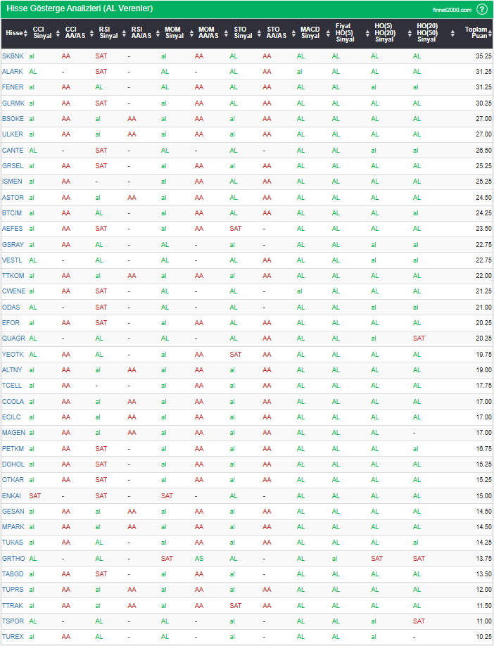 Bu çalışmada “AL” sinyali veren hisselerin tespiti amacıyla Borsa’da işlem gören BIST 100 hisseler değerlendirmeye alınmıştır. BIST 100 üzerinde teknik analizde kullanılan 12 gösterge yöntemi ile değerleme yapılarak puanlamaya gidilerek hisseler sıralanmıştır. Ancak hisse seçiminde teknik göstergelerin tek başına kullanılması yeterli değildir. Burada ön plana çıkan hisselerin temel analizle desteklemesi ve hisseyle ilgili son haber ve bilgilerin de değerlendirilerek işlemde bulunması, daha sağlıklı sonuçlar için yararlı olacaktır.