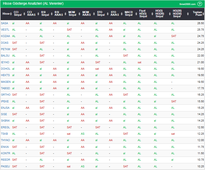 Bu çalışmada “AL” sinyali veren hisselerin tespiti amacıyla Borsa’da işlem gören BIST 100 hisseler değerlendirmeye alınmıştır. BIST 100 üzerinde teknik analizde kullanılan 12 gösterge yöntemi ile değerleme yapılarak puanlamaya gidilerek hisseler sıralanmıştır. Ancak hisse seçiminde teknik göstergelerin tek başına kullanılması yeterli değildir. Burada ön plana çıkan hisselerin temel analizle desteklemesi ve hisseyle ilgili son haber ve bilgilerin de değerlendirilerek işlemde bulunması, daha sağlıklı sonuçlar için yararlı olacaktır.