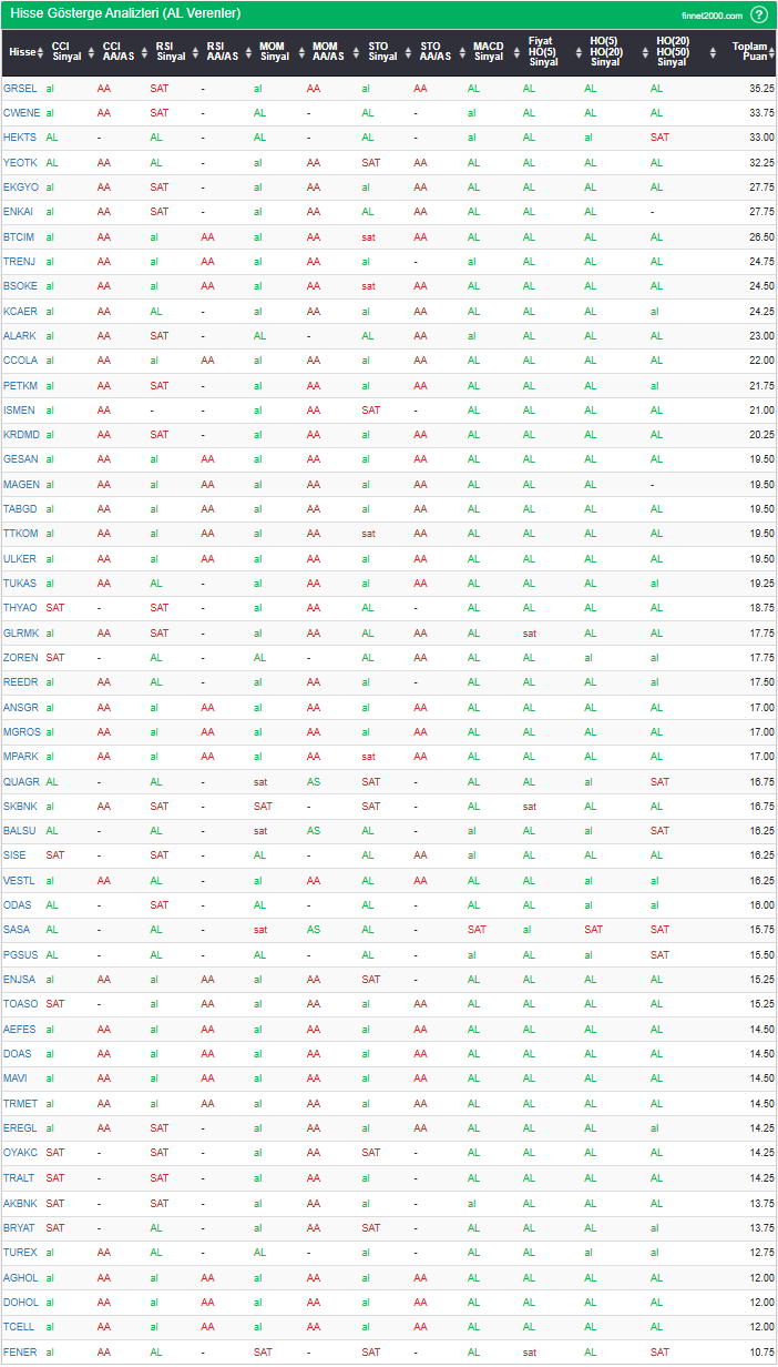 Bu çalışmada “AL” sinyali veren hisselerin tespiti amacıyla Borsa’da işlem gören BIST 100 hisseler değerlendirmeye alınmıştır. BIST 100 üzerinde teknik analizde kullanılan 12 gösterge yöntemi ile değerleme yapılarak puanlamaya gidilerek hisseler sıralanmıştır. Ancak hisse seçiminde teknik göstergelerin tek başına kullanılması yeterli değildir. Burada ön plana çıkan hisselerin temel analizle desteklemesi ve hisseyle ilgili son haber ve bilgilerin de değerlendirilerek işlemde bulunması, daha sağlıklı sonuçlar için yararlı olacaktır.
