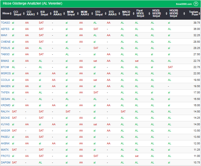 Bu çalışmada “AL” sinyali veren hisselerin tespiti amacıyla Borsa’da işlem gören BIST 100 hisseler değerlendirmeye alınmıştır. BIST 100 üzerinde teknik analizde kullanılan 12 gösterge yöntemi ile değerleme yapılarak puanlamaya gidilerek hisseler sıralanmıştır. Ancak hisse seçiminde teknik göstergelerin tek başına kullanılması yeterli değildir. Burada ön plana çıkan hisselerin temel analizle desteklemesi ve hisseyle ilgili son haber ve bilgilerin de değerlendirilerek işlemde bulunması, daha sağlıklı sonuçlar için yararlı olacaktır.