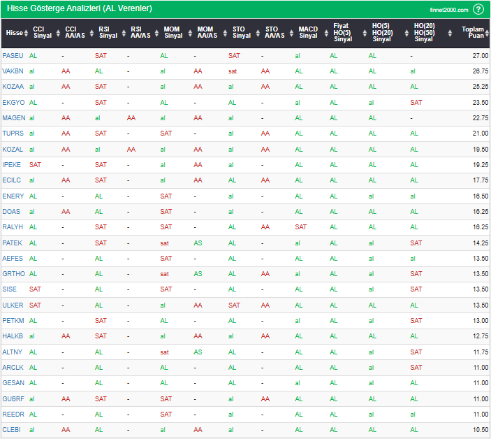 Bu çalışmada “AL” sinyali veren hisselerin tespiti amacıyla Borsa’da işlem gören BIST 100 hisseler değerlendirmeye alınmıştır. BIST 100 üzerinde teknik analizde kullanılan 12 gösterge yöntemi ile değerleme yapılarak puanlamaya gidilerek hisseler sıralanmıştır. Ancak hisse seçiminde teknik göstergelerin tek başına kullanılması yeterli değildir. Burada ön plana çıkan hisselerin temel analizle desteklemesi ve hisseyle ilgili son haber ve bilgilerin de değerlendirilerek işlemde bulunması, daha sağlıklı sonuçlar için yararlı olacaktır.
