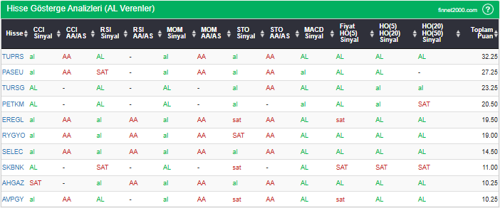 Bu çalışmada “AL” sinyali veren hisselerin tespiti amacıyla Borsa’da işlem gören BIST 100 hisseler değerlendirmeye alınmıştır. BIST 100 üzerinde teknik analizde kullanılan 12 gösterge yöntemi ile değerleme yapılarak puanlamaya gidilerek hisseler sıralanmıştır. Ancak hisse seçiminde teknik göstergelerin tek başına kullanılması yeterli değildir. Burada ön plana çıkan hisselerin temel analizle desteklemesi ve hisseyle ilgili son haber ve bilgilerin de değerlendirilerek işlemde bulunması, daha sağlıklı sonuçlar için yararlı olacaktır.