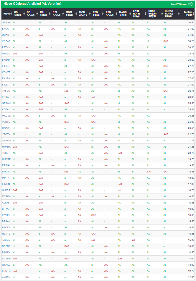 Bu çalışmada “AL” sinyali veren hisselerin tespiti amacıyla Borsa’da işlem gören BIST 100 hisseler değerlendirmeye alınmıştır. BIST 100 üzerinde teknik analizde kullanılan 12 gösterge yöntemi ile değerleme yapılarak puanlamaya gidilerek hisseler sıralanmıştır. Ancak hisse seçiminde teknik göstergelerin tek başına kullanılması yeterli değildir. Burada ön plana çıkan hisselerin temel analizle desteklemesi ve hisseyle ilgili son haber ve bilgilerin de değerlendirilerek işlemde bulunması, daha sağlıklı sonuçlar için yararlı olacaktır.