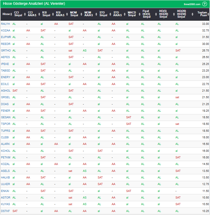 Bu çalışmada “AL” sinyali veren hisselerin tespiti amacıyla Borsa’da işlem gören BIST 100 hisseler değerlendirmeye alınmıştır. BIST 100 üzerinde teknik analizde kullanılan 12 gösterge yöntemi ile değerleme yapılarak puanlamaya gidilerek hisseler sıralanmıştır. Ancak hisse seçiminde teknik göstergelerin tek başına kullanılması yeterli değildir. Burada ön plana çıkan hisselerin temel analizle desteklemesi ve hisseyle ilgili son haber ve bilgilerin de değerlendirilerek işlemde bulunması, daha sağlıklı sonuçlar için yararlı olacaktır.