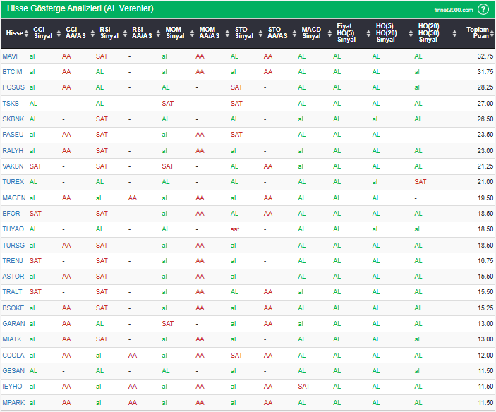 Bu çalışmada “AL” sinyali veren hisselerin tespiti amacıyla Borsa’da işlem gören BIST 100 hisseler değerlendirmeye alınmıştır. BIST 100 üzerinde teknik analizde kullanılan 12 gösterge yöntemi ile değerleme yapılarak puanlamaya gidilerek hisseler sıralanmıştır. Ancak hisse seçiminde teknik göstergelerin tek başına kullanılması yeterli değildir. Burada ön plana çıkan hisselerin temel analizle desteklemesi ve hisseyle ilgili son haber ve bilgilerin de değerlendirilerek işlemde bulunması, daha sağlıklı sonuçlar için yararlı olacaktır.