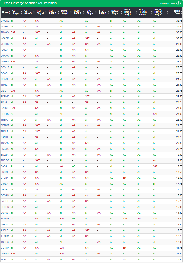 Bu çalışmada “AL” sinyali veren hisselerin tespiti amacıyla Borsa’da işlem gören BIST 100 hisseler değerlendirmeye alınmıştır. BIST 100 üzerinde teknik analizde kullanılan 12 gösterge yöntemi ile değerleme yapılarak puanlamaya gidilerek hisseler sıralanmıştır. Ancak hisse seçiminde teknik göstergelerin tek başına kullanılması yeterli değildir. Burada ön plana çıkan hisselerin temel analizle desteklemesi ve hisseyle ilgili son haber ve bilgilerin de değerlendirilerek işlemde bulunması, daha sağlıklı sonuçlar için yararlı olacaktır.