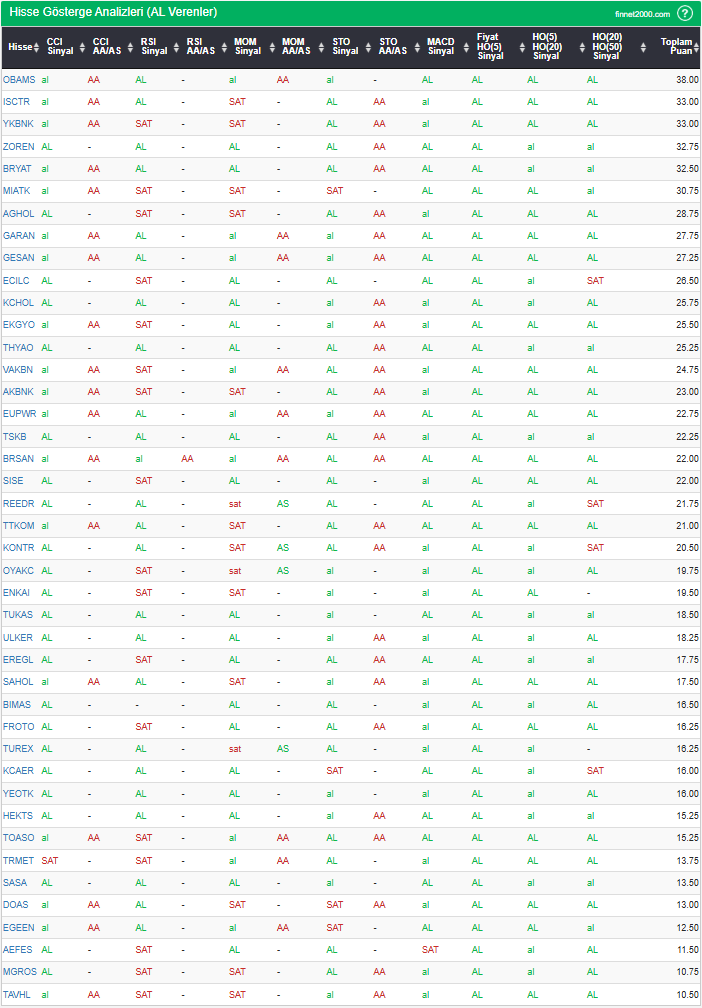 Bu çalışmada “AL” sinyali veren hisselerin tespiti amacıyla Borsa’da işlem gören BIST 100 hisseler değerlendirmeye alınmıştır. BIST 100 üzerinde teknik analizde kullanılan 12 gösterge yöntemi ile değerleme yapılarak puanlamaya gidilerek hisseler sıralanmıştır. Ancak hisse seçiminde teknik göstergelerin tek başına kullanılması yeterli değildir. Burada ön plana çıkan hisselerin temel analizle desteklemesi ve hisseyle ilgili son haber ve bilgilerin de değerlendirilerek işlemde bulunması, daha sağlıklı sonuçlar için yararlı olacaktır.