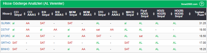 Bu çalışmada “AL” sinyali veren hisselerin tespiti amacıyla Borsa’da işlem gören BIST 100 hisseler değerlendirmeye alınmıştır. BIST 100 üzerinde teknik analizde kullanılan 12 gösterge yöntemi ile değerleme yapılarak puanlamaya gidilerek hisseler sıralanmıştır. Ancak hisse seçiminde teknik göstergelerin tek başına kullanılması yeterli değildir. Burada ön plana çıkan hisselerin temel analizle desteklemesi ve hisseyle ilgili son haber ve bilgilerin de değerlendirilerek işlemde bulunması, daha sağlıklı sonuçlar için yararlı olacaktır.