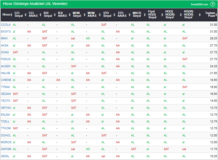 Bu çalışmada “AL” sinyali veren hisselerin tespiti amacıyla Borsa’da işlem gören BIST 100 hisseler değerlendirmeye alınmıştır. BIST 100 üzerinde teknik analizde kullanılan 12 gösterge yöntemi ile değerleme yapılarak puanlamaya gidilerek hisseler sıralanmıştır. Ancak hisse seçiminde teknik göstergelerin tek başına kullanılması yeterli değildir. Burada ön plana çıkan hisselerin temel analizle desteklemesi ve hisseyle ilgili son haber ve bilgilerin de değerlendirilerek işlemde bulunması, daha sağlıklı sonuçlar için yararlı olacaktır.