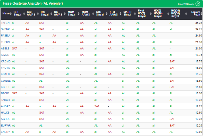 Bu çalışmada “AL” sinyali veren hisselerin tespiti amacıyla Borsa’da işlem gören BIST 100 hisseler değerlendirmeye alınmıştır. BIST 100 üzerinde teknik analizde kullanılan 12 gösterge yöntemi ile değerleme yapılarak puanlamaya gidilerek hisseler sıralanmıştır. Ancak hisse seçiminde teknik göstergelerin tek başına kullanılması yeterli değildir. Burada ön plana çıkan hisselerin temel analizle desteklemesi ve hisseyle ilgili son haber ve bilgilerin de değerlendirilerek işlemde bulunması, daha sağlıklı sonuçlar için yararlı olacaktır.